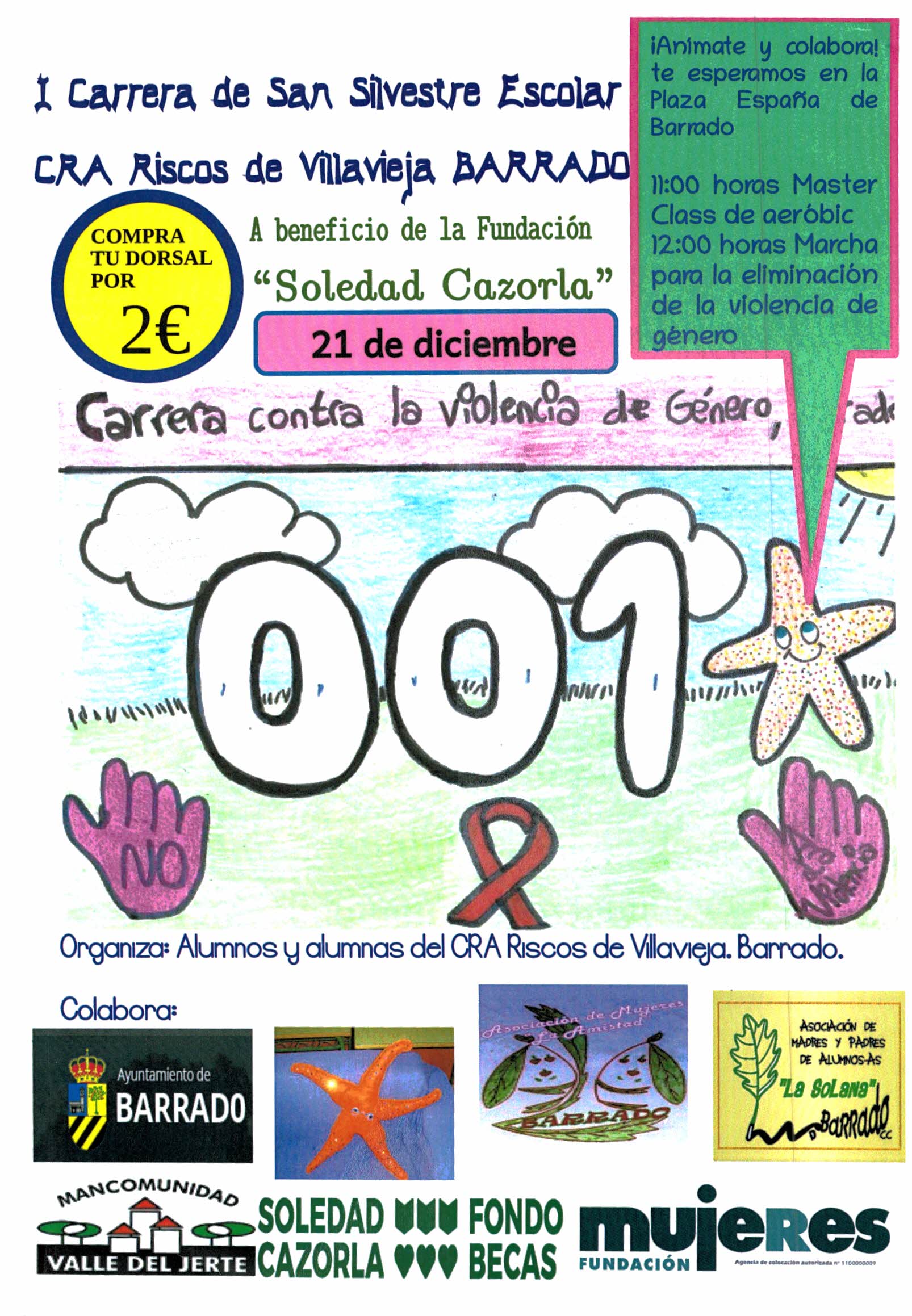 El próximo día 21 tenemos en nuestra localidad la 1ª San Silvestre escolar. Se han puesto a la venta dorsales solidarios y el importe recaudado será para la fundación "Soledad Cazorla"que ayuda a niños y niñas que han perdido a su madre por la violencia machista. La actividad está organizada por la comunidad educativa de Barrado y colaboran la AMPA de la localidad, el ayuntamiento y nuestra asociación de mujeres. Esperamos que os animéis a participar en esta carrera contra la violencia de género